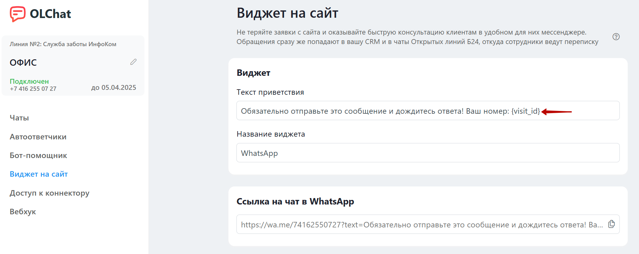 2. В разделе «Настройка виджета на сайт» в текст приветственного сообщения добавьте идентификатор Roistat **{visit id}.**