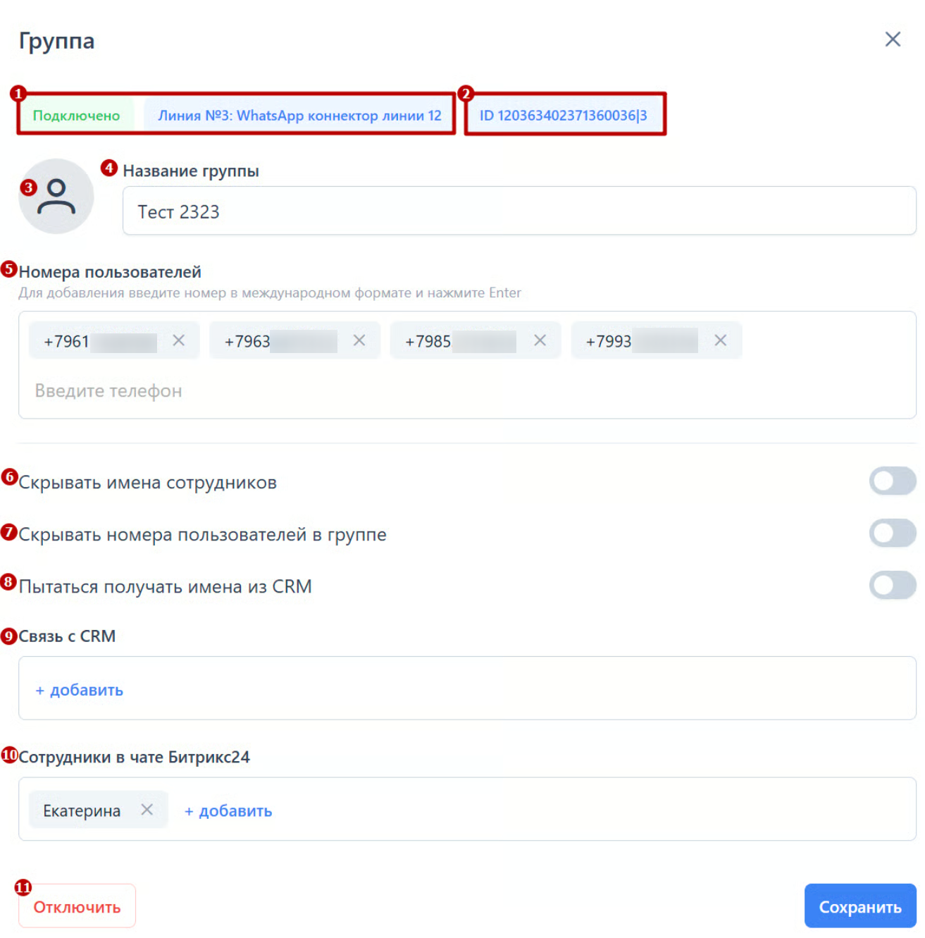 5. Номера пользователей. Отображает список номеров пользователей, состоящих в группе в данный момент. Для добавления введите номер в международном формате и нажмите Enter. Чтобы удалить пользователя из группы, нажмите на значок «✖» крестик напротив номера телефона пользователя.