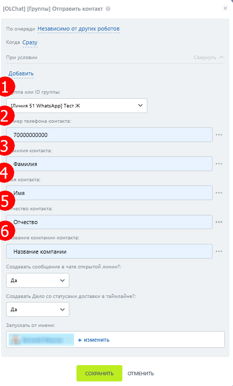 Робот «\[Олчат] \[Группы] Отправить контакт» позволяет создавать автоматизированные сценарии для отправки карточки контакта в подключенные группы при переходе лида или сделки в определённый статус.