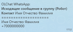 В чате открытой линии, связанной с  группой, отправленная роботом карточка контакта будет выглядеть так: