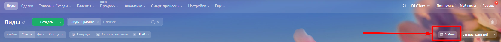 Перейти в раздел «Роботы» из списка лидов, либо карточки лида в CRM (в системе управления взаимоотношениями с клиентами).