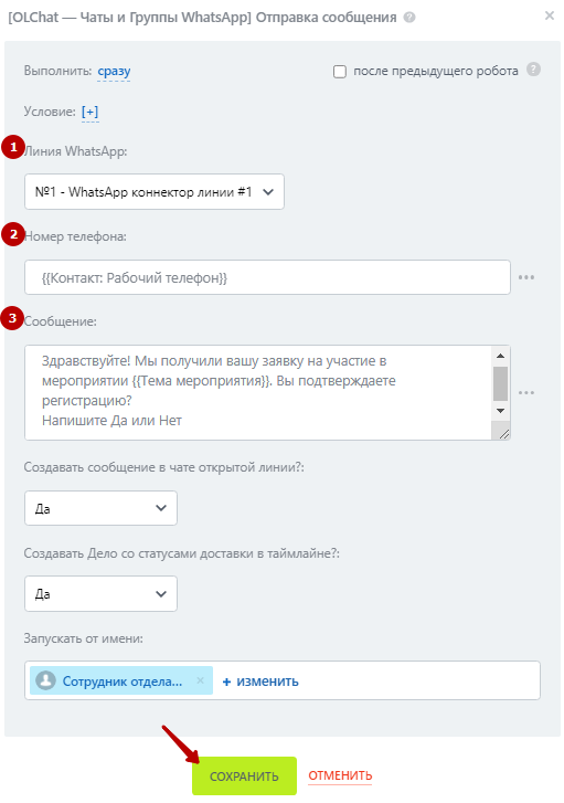 На стадию **«Новая регистрация»** добавим робота **«\[Олчат — Чаты и Группы WhatsApp] Отправка сообщения»,** в котором попросим клиента подтвердить регистрацию на мероприятие.