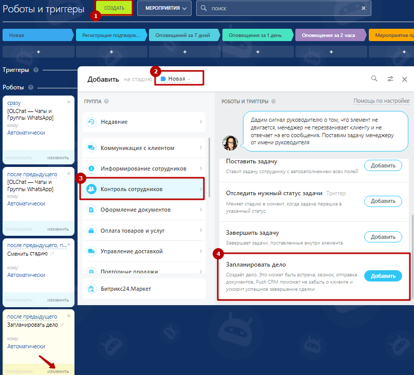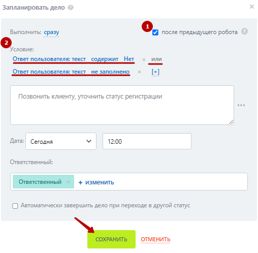 3. Если клиент пишет в ответ нет или не отвечает дольше заданного времени – ставим на ответственного по сделке Дело позвонить клиенту.
