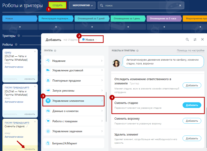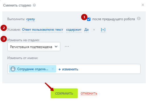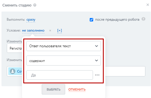 Далее необходимо обработать ответ клиента. Если клиент ответил «Да», переведём сделку в стадию «Регистрация подтверждена». Добавим робота **«Сменить стадию»** и выполним его настройку.
