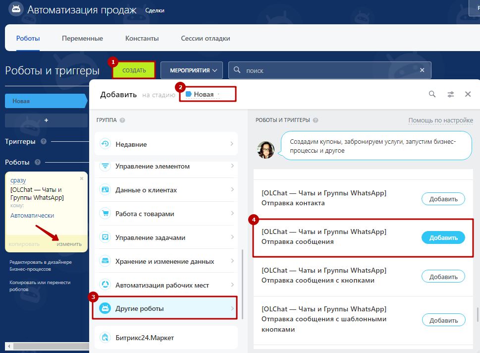 В процессе взаимодействия с клиентом на любом этапе сделки может происходить отправка клиенту сообщений в WhatsApp и получение от него ответов. Если вопросы задаваемые клиенту всегда одинаковые, а ответы получаемые от клиента однотипные, этот процесс можно автоматизировать с помощью роботов [otpravka-soobsheniya](https://docs.olchat.io/roboty-i-aktiviti/roboty/otpravka-soobsheniya "mention") и [ozhidanie-soobsheniya](https://docs.olchat.io/roboty-i-aktiviti/roboty/ozhidanie-soobsheniya "mention")