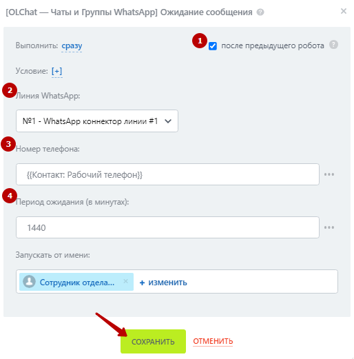 4. Укажите **Период ожидания (в минутах),** в течение которого робот будет ожидать сообщение от клиента.