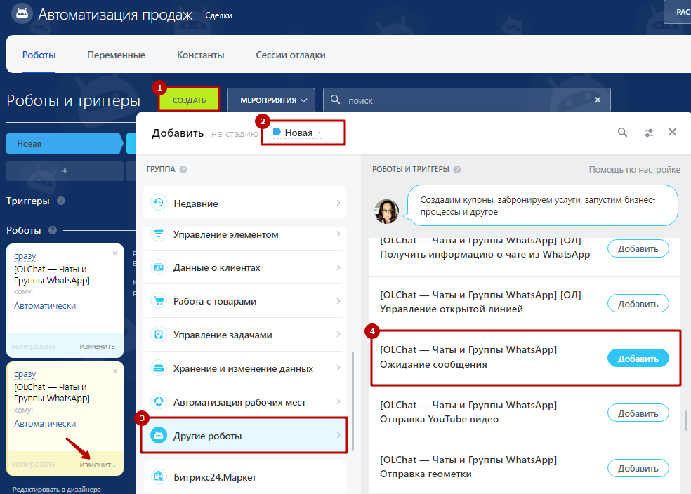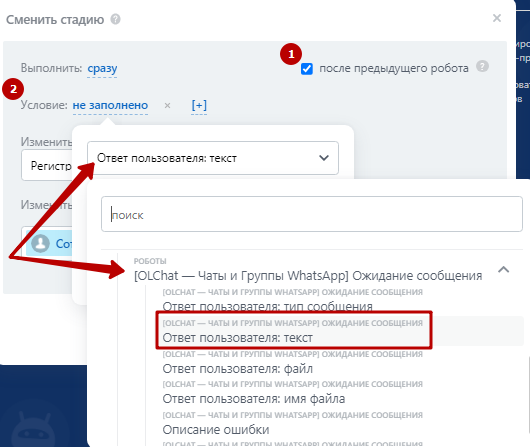 Далее, на текущую стадию добавим робота **«\[Олчат — Чаты и Группы WhatsApp] Ожидание сообщения».**