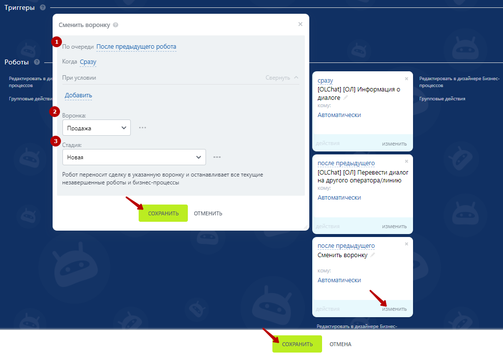 После смены стадии в воронке «Предпродажа» на стадию «Сделка успешна», сработают роботы, которые произведут смену воронки и ответственного за чат: