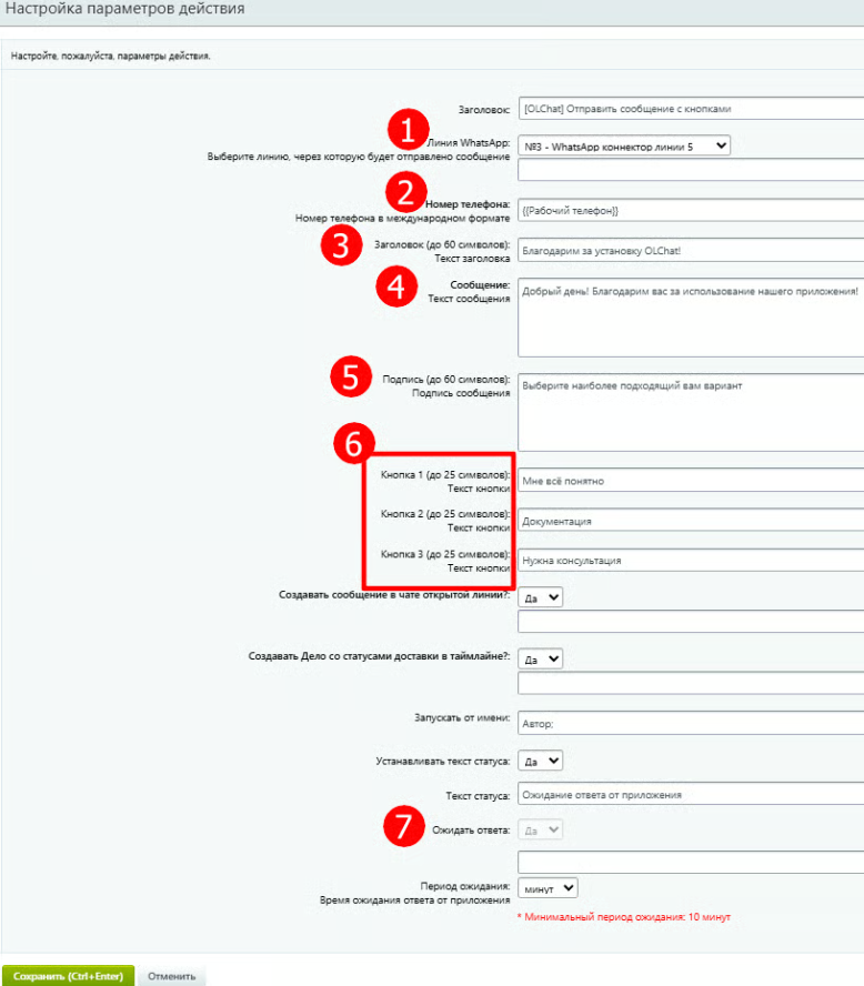 7. В поле **«Ожидать ответ сообщения»** выберете **«Да»,** если хотите дождаться ответа пользователя и использовать его выбор кнопки в дальнейших сценариях автоматизации или **«Нет»,** если в этом нет необходимости.