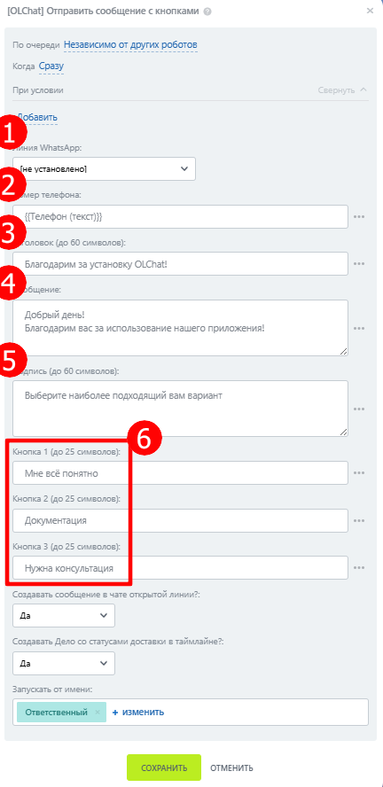 6. В полях **«Кнопка 1», «Кнопка 2», «Кнопка 3»** укажите текст, который будет выведен на кнопках в сообщении. Ограничение длины текста – 25 символов.