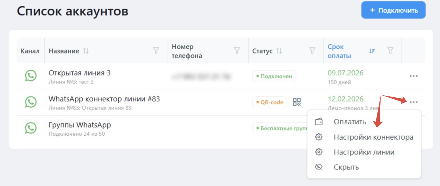 После подключения открытой линии можно перейти к подключению коннектора. Для этого напротив подключаемого коннектора нажмите на значок меню «•••» и выберите пункт «Настройки коннектора».